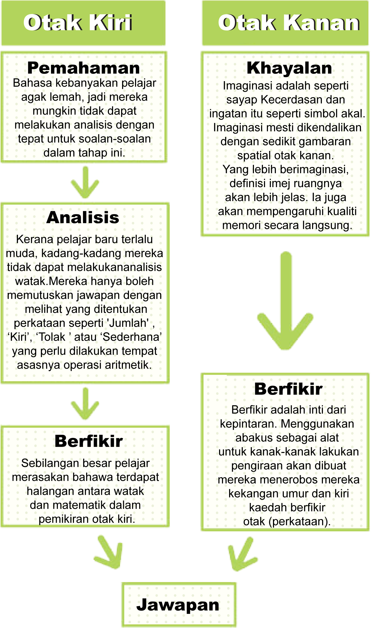Otak manusia boleh dibahagikan kepada dua bahagian iaitu kiri dan kanan. Bahagian kiri otak dipanggil otak kiri yang mengawal bahasa dan aksara, manakala bahagian kanan otak dipanggil otak kanan yang memanipulasi imej. Walaupun keduadua bahagian otak boleh digunakan untuk berfikir, kebanyakan kanakkanak hanya menggunakan otak kiri mereka untuk berfikir dan menyelesaikan masalah kerana kekurangan latihan otak kanan. Bagi menggalakkan pelajar berfikir dengan menggunakan otak kanan mereka, aritmetik mental yang bijak telah menjalankan kaedah penerokaan kendiri untuk mereka. Ia merupakan kaedah untuk berfikir melalui imej dan belajar melalui perkataan selepas itu. Semasa proses penerokaan, pelajar akan dapat memperoleh pengetahuan dengan baik. Hasil penerokaan kendiri adalah jelas. Ia bukan sahaja mempercepatkan kelajuan analitikal pelajar dalam menyelesaikan masalah matematik tetapi juga dapat memudahkan soalan pada masa yang sama.